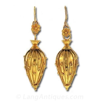 18K Yellow gold Victorian Etruscan revival urn shaped drops decorated with gold beading and fine wire work. These drop earrings measure 1 3/4 long.