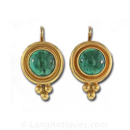 Etruscan style 22K yellow gold drop earrings featuring two round bluish green tourmaline cabochons (3.75 carats total weight) bezel set with a small flourish at the bottom. These earrings measure 5/8 long by 1/2 wide.