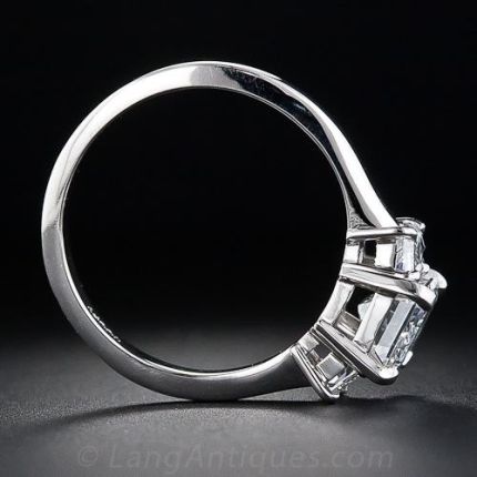 A super fine, ice-white emerald-cut diamond shines brightly in this contemporary diamond engagement ring. The 1.98 carat emerald cut diamond, accompanied by a GIA reported stating D color, VS1 clarity, is classically set in this sleek, streamline platinum mounting and embraced by a trapezoidal cut diamond on either side. The ultimate in a classic diamond engagement ring.