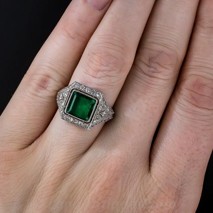 A beautifully ornamented and diamond-studded, original 1920s-1930s Art Deco platinum ring featuring a richly saturated, verdant green, square-cut old-mine Colombian emerald that, by design, is cut unusually shallow, creating the effect of an entrancing emerald window that sits very low on the hand, floating in a delicate milgrained frame. Although the emerald is estimated at one carat, it displays the outline of a stone more than double its actual weight. A true gem, masterfully handcrafted in lustrous platinum, in a finger size 6 1/2.