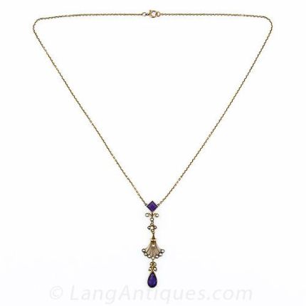 An elegant and enchanting necklace from the turn of f the twentieth century. Two deep royal purple amethysts are joined by a slender and graceful stylized fan of tiny seed pearls. A delight. The drop measures 2 inches long by 1/2 inch.