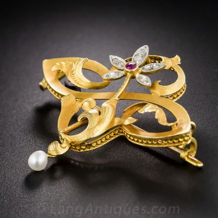 A lovely and lyrical fin-de-siecle brooch with a flowing frame with curling leaves and a pretty rose-cut diamond and ruby fleur glittering at the heart of it all. Beautifully crafted in 18k gold and platinum with a rich high-carat 'bloom' - circa 1900. A shimmering natural pearl drop adds an additional grace note. With French hallmarks, 1 1/2 by 1 1/2 inches.