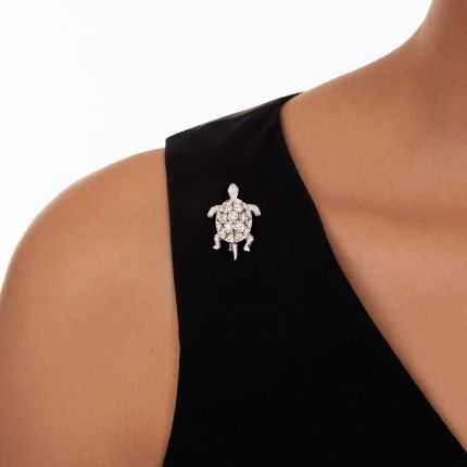 Although we try not to play favorites, this tiny turtle by Boucheron has stolen our hearts. Measuring a mere 1 1/8 by 3/4 inches his carapace is realistically pierced, detailed with fine millegrain edges, and sparkles all over with supremely white and crisply sparkling round brilliant cut diamonds. Finely textured, his head, legs, and tail all move, as he slowly--but surely--makes his way to your lapel. Did we mention that he's French? Total diamond weight, .45 carat. Rendered in 18K white gold.