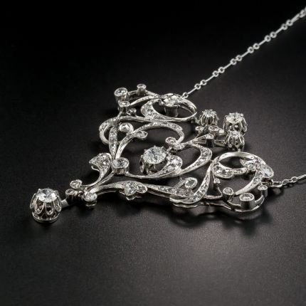 Curves, and swirls, and sparkle--oh, my! Light and lacey, this splendid necklace is a showpiece for the iconic characteristics of early 20th century jewelry. A brightly shining European-cut diamond dangles prettily in a stylized heart shape, surrounded by an exquisitely rendered design set with European and rose-cut diamonds, culminating below with another lovely dangle. A mix of buttercup and bezel settings and fine millegrain edging add to the beauty of this delightful French Belle Époque jewel. Total diamond weight, 1.70 carats. In platinum. Figaro chain measures 18 inches.