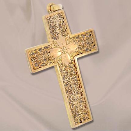 A French 18K yellow gold cross pendant featuring delicate pierced work with floral and foliate motifs. This pendant measures 2 1/4 long by 1 1/2 wide.