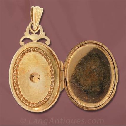 18K Rose gold oval shaped locket centered with a sweet seed pearl and scroll motifs, French hallmarks. This locket measures 1 3/4 long by 7/8 wide.