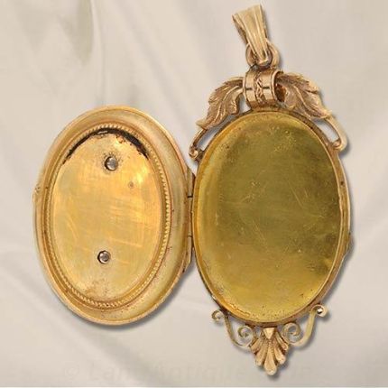 18K Rose gold French 19Th century oval locket with foliate and scroll motifs accented with five delicate seed pearls. This locket measures 2 1/8 tall by 7/8 wide.