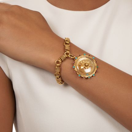 You can pick the petals off a daisy to determine if the object of your affection loves or loves you not, or you can have much more fun doing so by playing Roulette de L'amour with this fascinating Van Cleef & Arpels charm bracelet. A chunky chain of velvety gold ribbed and rope-like links is adorned with a portable roulette wheel marked with possible outcomes (in French, of course): un peu (a little), beaucoup (a lot), pas de tout (not at all), a la folie (madly), passion (passionately), je t'aime (I love you). Accented around its perimeter with bezel-set cabochon rubies and turquoise, just give it a spin and a single turquoise bead will reveal the level of reciprocity. Fabulous fun! Crafted in 18K gold, it measures a bit over 7 1/2 inches. Charm can be removed and worn as a pendant. 1960s.