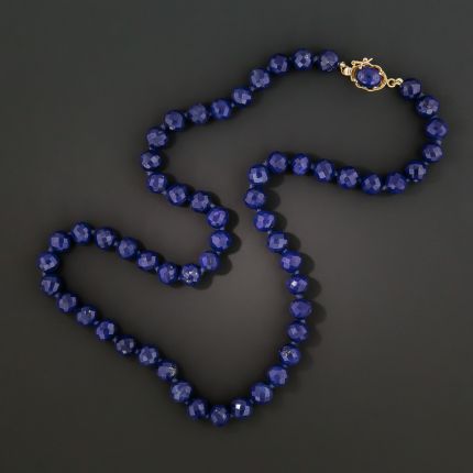 The fifty-seven faceted, intensely deep, yet bright cobalt blue gem quality lapis beads in this easy-to-wear necklace will add plenty of gleaming color around your neck. These beads are the highest quality lapis we have ever seen! A 14K gold clasp set with a cabochon lapis keeps them all together. Mid- 20th Century. Measures 18 1/4 inches.