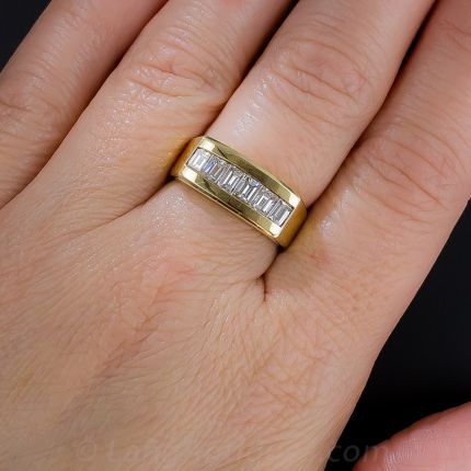 14K Yellow gold gent's diamond channel-set band containing six bright-white emerald-cut diamonds with a total weight of 1.30 carats. A classic statement. Ring size 8 1/2.
