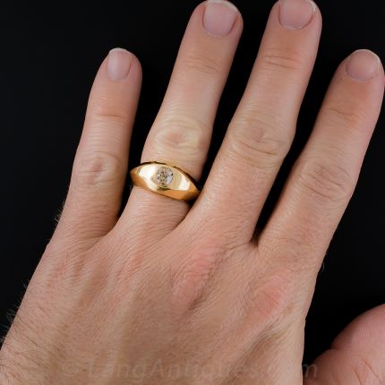 A handsome, sleekly sculpted gentleman's ring in 18k rose-yellow gold, circa 1930-1940. This sophisticated ring features a flush-set .85 carat golden-brown, natural-color old-mine cut diamond. Suave. French eagle assay mark on outside of shank. Ring size 9.