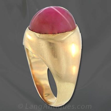 14K Yellow gold gypsy set gents ring featuring a 20.00 carat synthetic star ruby oval cabochon.