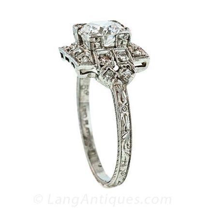 Platinum ladies Art Deco style solitaire ring featuring one round brilliant cut diamond (.96 carat E color, VS1 Clarity, EGL certified) centered in a square box surrounded by the crisp geometry of a diamond set square outline containing 16 round diamonds weighing .25 carat total.