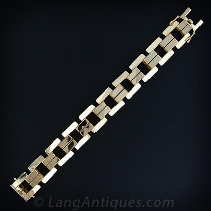 Although masterfully crafted in the manner and style of its mid-century Retro counterparts, we are not quite certain about the Vintage of this alluring and substantial architecturally influenced bracelet in glistening 14K yellow gold. A timeless (and ageless) treasure.