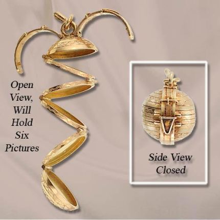 18K Yellow gold ball locket which unfolds to reveal six round picture frames and folds up into a tidy ball clasped with two buckle motif straps. This ball measures about 3/4 long closed and about 3 1/2 when opened.