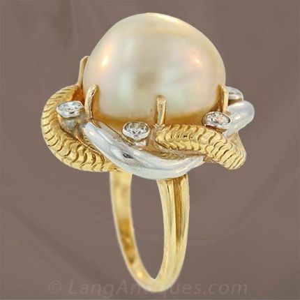 Lustrous 15 mm golden south sea pearl is the focus of this modern ring created by Tiffany & Company using intertwined platinum and 18K yellow gold interspersed with diamonds as a frame. The diamonds have a total weight of .50 carat (F-G color, VS clarity).