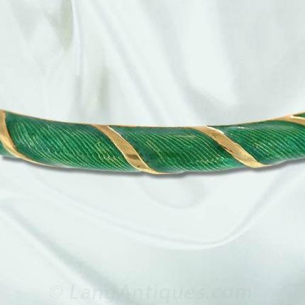 14K Yellow gold hinged bangle with beautiful bright green enamel with a ribbon of gold looping around. This hinged bangle measures 5.5 mm wide. There is some wear in the enamel on one portion of the bracelet.
