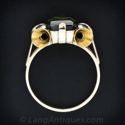Crafted in rich, two-tone 18 karat yellow gold, circa 1940s-1950s, bow-like volutes embrace a square, emerald-cut green tourmaline that appears to float in the mounting. A fun, fashionable and wearable mid-century vintage ring. 1/4 inches high by 5/8 inch wide.