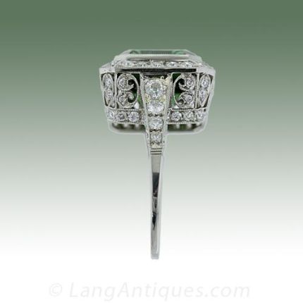 Stately antique style platinum ring set with a beautiful emerald cut green tourmaline wrapped with European cut diamonds and set atop a fancy pierced gallery sprinkled with glittering diamonds.The Gemstones are described as follows:One Emerald Cut Green TourmalineWeight: 7.50 carats134 European Cut DiamondsWeight: 1.10 carats total weightColor: G-IClarity: VS1-SI