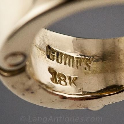A pair of none too ferocious (very cute in fact) three-dimensional Chinese Guardian Lions (a.k.a. Foo dogs) stand guard atop this very striking, unusual and highly-translucent carved jadeite pendant. The jade ranges in color from crystal white at the extremities to very light green in the center. The 18 karat yellow gold clasp is signed by 'Gumps', San Francisco's legendary purveyor of oriental collectables. The pendant measures 1 1/16 inches by 1 3/8 inches; the clasp measures 1/2 inch.