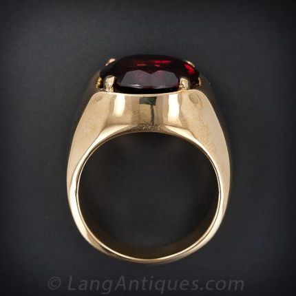This large scale gents ring in solid 14K yellow gold is set with a 9.30 carat round cut, deep red garnet. A masculine, handsome, no-nonsense ring.