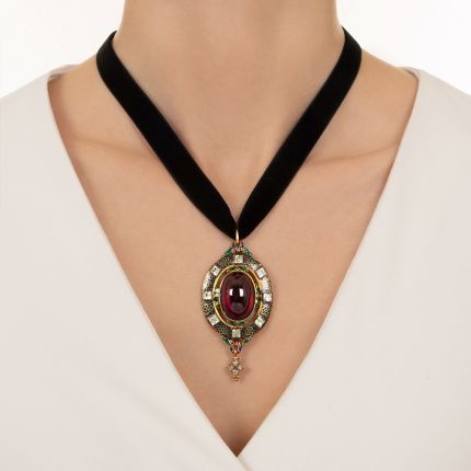 Measuring an impressive 2 1/8 inches by 1 1/4 inches, this is one of the finest and most strikingly stunning *Holbeinesque jewels we've ever encountered. An impressive 28.00 carat garnet cabochon (aka carbuncle) is dramatically framed by glossy blue, green and red enameled flowers interspersed with gleaming square-cut diamond-like chrysoberyls. The reverse is adorned with fanciful hand engraving and houses an open locket compartment. Fabulous! Circa 1870. *Named after the great 16th century German artist Hans Holbein, not because he designed them but because they appeared on many of his portrait paintings.