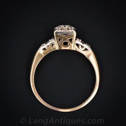 This is a sweet illusion head petite diamond ring from the 1940's. A .20 carat transitional round brilliant cut diamond is set in an illusion head with four tiny diamonds set around the center diamond to add a little sparkle. An additional diamond is set on either shoulder in this two tone 14 karat gold ring.