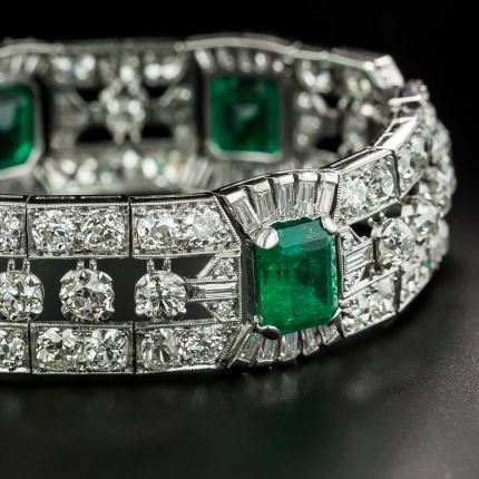 Extraordinary! Four gorgeous rich green Colombian emeralds, together weighing 14.36 carats - accompanied by a GIA Gemological Certificate stating: Colombia, No Indication of clarity enhancement,, embellished north and south with gleaming fans of baguette diamonds, glisten and glow against a backdrop of brilliant bright white European-cut and baguette diamonds in this rare and radiant Art Deco bracelet hand fabricated in platinum - circa 1920s-30s, Its uncommon design (3 emeralds up front, one on the back) is composed of alternating emerald-centered diamond links and all diamond links, all set with sizable European-cut diamonds totaling 21 carats. Absolutely stunning and impressive! Total diamond weight, 25.65 carats. It measures 6 3/4 inches long by 3/4 inch wide.
