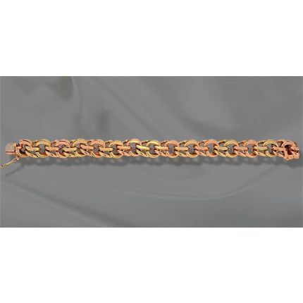 Handmade 14K rose and yellow gold charm bracelet with a hefty feel and remarkable craftsmanship, circa 1940s. This bracelet has a box clasp and measures 1/2 wide by 8 long.
