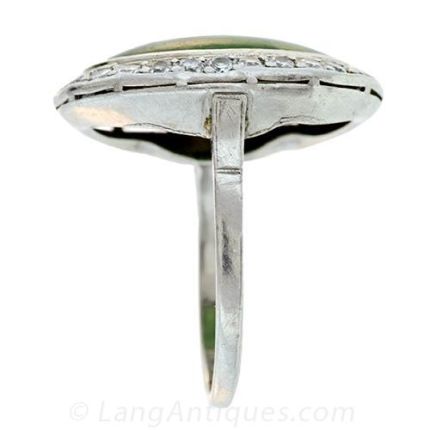 This is a simple, stylish and timeless platinum ring centers a rich green oval jadeite jade cabochon. The jade is semi translucent with the unique quality of being a consistent grassy green that varies with the intensity of light present. It is bezel set and wrapped within a border of glimmering round brilliant cut diamonds totaling 0.50 carats. It is by Birks, a well known Canadian jewelry house with a long tradition of fine jewelry making.