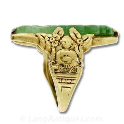 22K Yellow gold Chinese jade ring with a mottled green carved jolly Buddha with carved floral motifs and seated Buddhas on the shoulders.