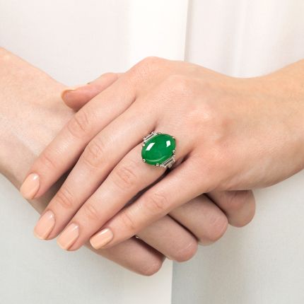 An impressive Art Deco ring set with a jadeite cabochon of vibrant green, accompanied by a GIA certificate stating natural color, flanked by two elegant trapezoid diamonds with baguette diamonds on the shoulders. The handmade platinum setting is expertly sculpted. Sophisticated and lovely.
