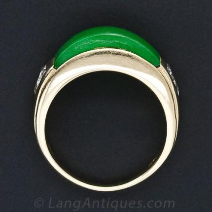 A thick and translucent vibrant green 'saddle' jade curves around the finger and is met at each end with a sparkling trillion diamond in this sleek and very cool estate ring produced during the latter-twentieth century in Los Angeles by notable manufacturer George Barmache. The ring is accompanied by a GIA Lab Report stating: Natural Color. No indications of impregnation. .70 carat total diamond weight. The inside of the 18 karat gold ring shank is stamped: GB. The jadeite measures about 5/8 inch by 5/16 inch.