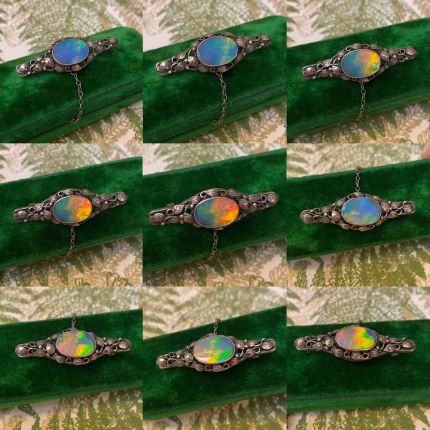 Although unsigned, this fabulous silver and black opal pin no doubt originates from the name on the box - Just Andersen of Copenhagen, and the address - Amagertorv 4, is now the home of Jeorg Jensen! Be that as it may, the true star of the show is the fabulous featured black opal that displays a mesmerizing light show of electric iridescent rainbow colors. A magnificent gem enwrapped in silver leaves. A rare and ravishing collectable work of wearable art - circa 1900. Skonvirke denotes the Scandinavian version of Arts & Crafts design. 1 5/8 by 9/16 inch.