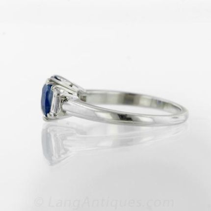Kashmir sapphires, from the Kashmir region between India and Pakistan, are the highest quality and most beautiful sapphires due to their exceptional rich cornflower blue color. This stunner is a 1.85 carat cushion cut set in a classic platinum setting flanked by trapezoidal cut diamonds. Gorgeous! The Gemstones are described as follows: One Cushion Cut Sapphire Origin: Kashmir Weight: 1.85 carats Measurements: 7 x 6.55 x 4 mm Two Trapezoidal Cut Diamonds Weight: .40 carat total weight Color: F-G Clarity: VS