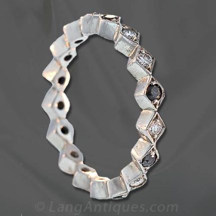 Platinum ladies diamond eternity band set with round diamonds (.30 carat total weight, G-I color, VS clarity) in diamond shaped settings alternating with round black diamonds (8 total, .25 carat total weight). This band is a size 5 3/4.
