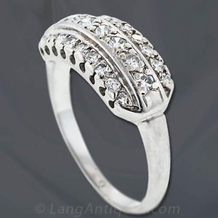 Platinum ladies diamond wedding band featuring three rows of single cut diamonds (.50 carat total weight, G-I color, VS-I1 clarity) prong set in fishtail settings, circa 1950s. Top plaque measures 18 X 7.5 mm and the shank measures 2 mm.