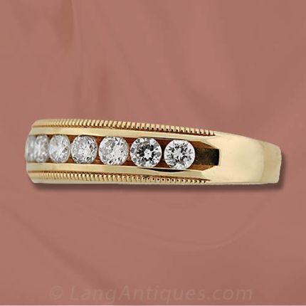 14K yellow gold ladies diamond wedding band set with eleven round brilliant cut diamonds (.50 carat total weight, H-J color, SI-I1 clarity) channel set across the top with milgrained edges. This band is 3-4 mm wide.