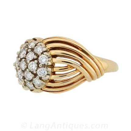 14K Yellow gold modern design ladies ring with a low dome circular wire structure centering a diamond set dome containing 17 round diamonds (.50 carat total, color range G-H, clarity range VS).