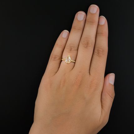 A rare and enchanting stone - a glittering rose-cut pear-shaped diamond, weighing 1.71 carats and imbued with a sunshiny yellow hue, is displayed in refined neoclassical fashion in a Lang vintage-style* mounting rendered in rich 18K yellow gold and modestly embellished on the shoulders with tiny twinklers. Accompanied by a GIA Grading Report Stating: W-X Color, SI2 Clarity (based on a transparent, virtually invisible, natural negative crystal located at the very top of the stone - i.e., the best SI2 ever). A distinctive one-of-a-kind dazzler - currently ring size 6. *We have distilled and refined the enduring elegance of early-20th-century styles to newly present original vintage diamonds in our own line of vintage-inspired engagement rings.