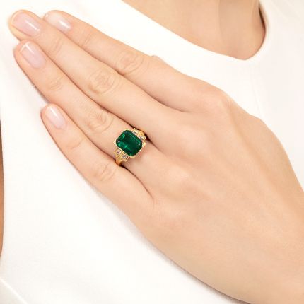 You'll have to look at the inside of this ring to find a surface that is not intricately decorated with exquisite detail. Creating an extraordinary pedestal for a gorgeous, richly saturated, vivid, crystalline bluish-green emerald - weighing 3.96 carats - the mounting of this Lang Collection ring is thoroughly embellished with a mix of neoclassical patterns, fine ribbing, and delicate millegrain edging. The enchanting gem is held by ornate prongs that extend from a distinctive side gallery and is accented in sparkle east and west by European- and Swiss-cut diamonds. A work of masterful craftsmanship and an exceptional beauty. Crafted in 18K yellow gold, it is currently ring size 6. GIA gemological report states: Clarity Enhancement, minor (F1), Namibia - Origin.