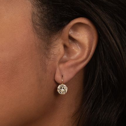 In these dazzling, bold and blazing vintage style ear drops, a matched pair of European-cut diamonds (early-20th-century vintage ), together weighing 5.15 carats, dazzle with a lively sunshiny hue. Classic 24-hour ultra-sparklers. Accompanied by GIA Grading Reports stating: 2.58 carats, Q-R color/ VS2 clarity and 2.57 carats, U-V color / VS1 clarity. Hand fabricated in 18K gold by Lang.