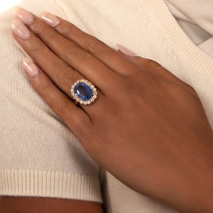 "I will do water--beautiful, blue water." -- Claude Monet. The gloriously clear and refreshing cornflower blue sapphire that glistens and gleams atop this breathtaking, classic vintage style halo ring could certainly have inspired Monet to paint the calming waters that he described. Weighing an impressive 8.89 carats, the enchanting gem is encircled by a marvelous mix of brightly glittering European-cut diamonds supported by artfully hand-engraved herringbone pattern shoulders. An impressive and cheerful new friend for your finger by Lang. Total diamond weight, .96 carat. Accompanied by a gemological report from Stone Group Laboratories stating: Natural. No Indications of Thermal Enhancement. Ceylon (Sri Lanka) - Origin. Hand fabricated in 18K gold, currently ring size 6 1/4.