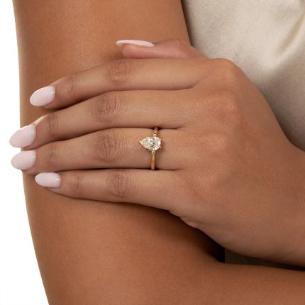 Beautifully curved, a .94 carat pear-shaped diamond (circa 1920) sparkles with abandon atop a sleek 18K yellow gold band in this elegant Lang Collection* ring. Needing little other embellishment, it is subtly enhanced by trios of tiny round brilliant-cut diamonds on each millegrain-edged shoulder. Sublime. Total diamond weight, .97 carat. Hand fabricated in platinum, currently ring size 6 1/4. GIA diamond grading report states: H color - VS2 clarity. *We have distilled and refined the enduring elegance of early-20th-century styles in our own line of vintage-inspired engagement rings, using 100% recycled precious metals and ethically sourced melee diamonds.