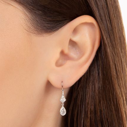 Swinging sweetly from your lobes, these dainty Lang Collection* Edwardian-style earrings shine with icy white pear-shaped diamonds that dangle beneath elegant shield shapes set with bright round brilliant cut diamonds. Delightful! Total diamond weight, 1.09 carats. In platinum. GIA Diamond Grading Reports for pear diamonds state: .49 carat E color - VS1 clarity, .40 carat D color - VS2 clarity. *We have distilled and refined the enduring elegance of early-20th-century styles to newly present original vintage diamonds and gemstones in our own line of vintage-inspired jewels and engagement rings using 100% recycled precious metals and conflict-free diamond melee.