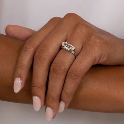 We have distilled and refined the enduring elegance of early-20th-century styles to newly present original vintage diamonds and gemstones in our own line of vintage-inspired jewels and engagement rings, using 100% recycled precious metals and conflict- free diamond melee. In the case at hand--and perhaps on yours!--we've created an understated, yet stunning, new home for a truly spectacular, one-of-a-kind diamond. Weighing 2.18 carats, it is described by the GIA as a 'modified rectangular brilliant,' and has the appearance of an extra-elongated, straight-sided oval. The uniquely shaped stone scintillates horizontally in a gleaming platinum mounting, modestly embellished on the side gallery with delicate filigree work dotted with eight tiny twinklers. An exceptional and distinctively different one-of-a-kind ultra-sparkler. Accompanied by a GIA Diamond Grading Report stating: J color - VS1 clarity. Currently ring size 6 1/2.