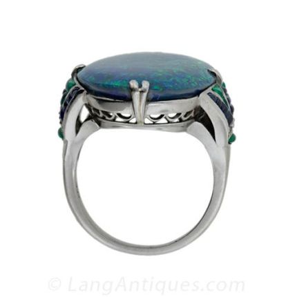 This large and lavish oval black opal with it's spectacular canvas of shimmering blues and greens is reminiscent of an Impressionist masterpiece by Monet. The opal, which we estimate to weigh between 14 and 15 carats (but appears much larger) is dramatically presented in a platinum setting of buff-cut sapphires and emeralds with a tad of diamond accents reminiscent of Louis Comfort Tiffany's stained glass windows. This exceptional ring was produced by none other than Peter Truman, the chairman and scion of the estimable London jewellers, W. Truman Ltd. This supreme example of jewelry artistry measures slightly more than one inch in length by 3/4 inch wide. English hallmarks.