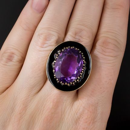 This bodacious bauble glistens and gleams with a queen size (about 15 carats) faceted oval amethyst, with an entrancing lavander-purple color, dramatically presented in a black enameled border in a hand fabricated and comfortably fashioned 14K yellow bold gold ring. This dark and mysterious showpiece measures 1 1/8 inch by 1 inch and is a ring size 8 3/4.