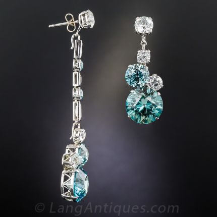 Wowzer! We've never seen anything quite like these dynamic vintage dazzlers. Clocking in at just under 3 inches long (at full length, and 1 3/8 inches minus the removable center section), these singular and sensational showstoppers, handcrafted in 14K white gold, culminate with a matched pair of huge blue zircons (about 14 carats each, or 9/16 inch diameter). These in turn are crowned by a smaller pair of blue zircons (totaling 8.50 carats), along with two pairs of diamond white zircons. The extension sections alternate with white baguettes (zircons) and small blue zircons, surmounted by a white zircon stud. Full length or shortened, this extraordinary pair will dazzle, impress and amaze! Circa 1930s-40s.