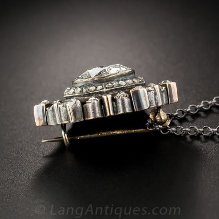 This spectacular vintage bauble beams bright and beautiful with a scintillating rose-cut diamond, with an estimated weight of 3 carats, and the dimensions of a 6-7 carat modern-cut stone. The entrancing diamond glistens and glows from within a foil-backed collet setting, inside a double hexagonal frame glittering with small rose-cut diamonds. Crafted in darkened silver over 18K rosy gold, this unique and impressive jewel most likely originates from early-to-mid-twentieth century Holland, where and when they specialized in one-of-a-kind pieces in emulation of 18th century English-Georgian jewels. 1 1/8 inches from point to point. Please view our entire Rose Cut Retrospective here.
